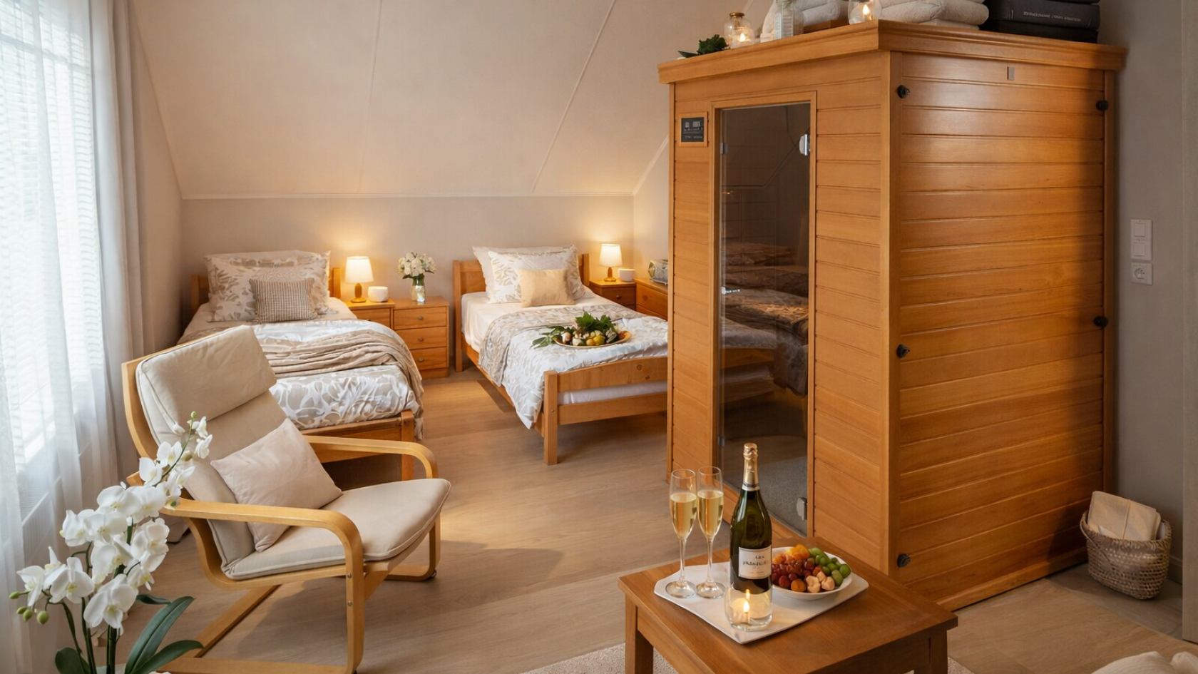 Součástí našeho penzionu je nově i komfortní wellness apartmán s infrasaunou, který nabízí ideální podmínky pro relaxaci, regeneraci i aktivní odpočinek. Apartmán je navržen s důrazem na klid, soukromí a příjemnou atmosféru. Je ideální pro jednotlivce, páry i celé rodiny.